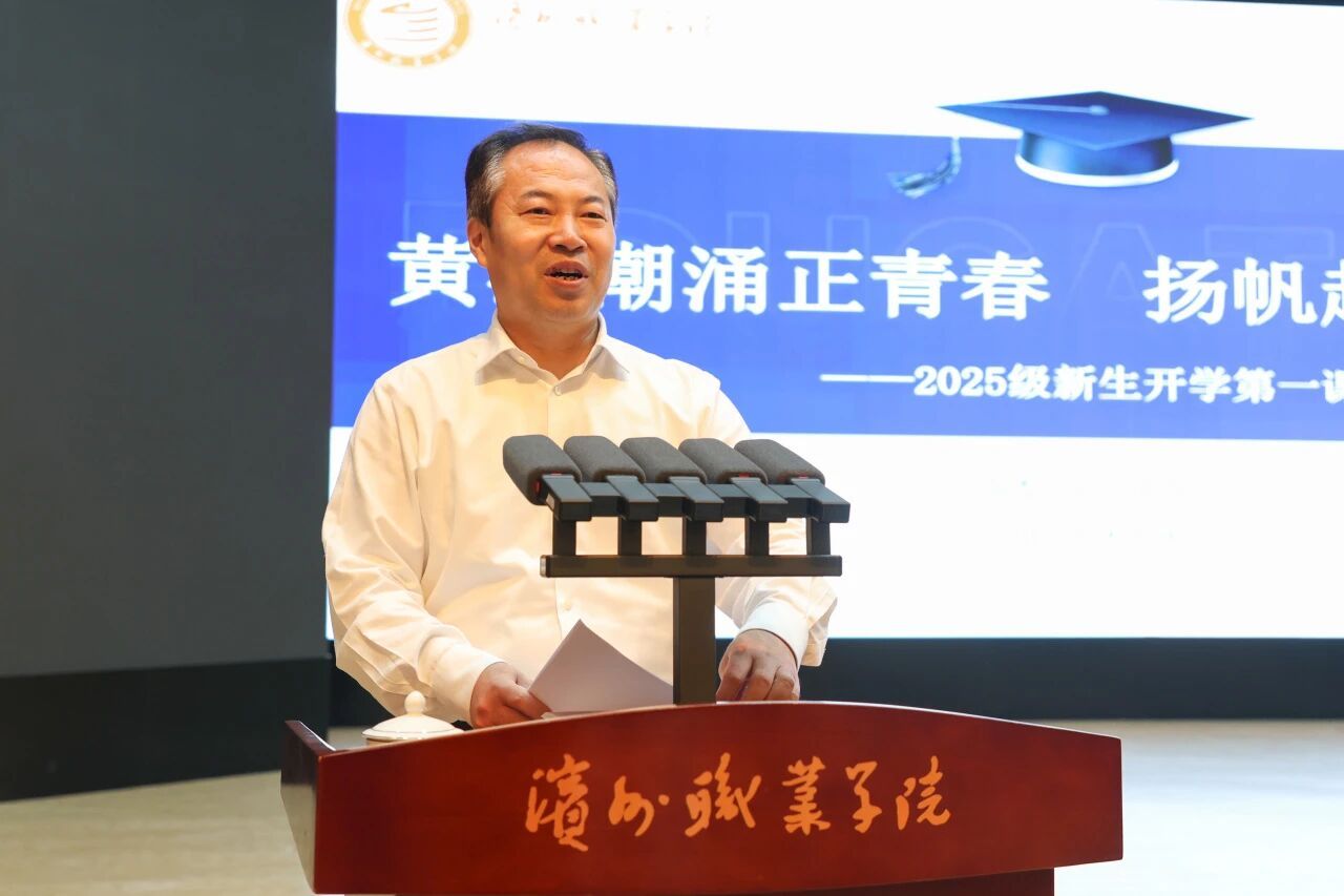 刘荩一以《黄河潮涌正青春,扬帆起航启新程》 为题,围绕“滨州是一座什么样的城市”“滨职是一所什么样的学校”“未来三年该如何度过”三大问题,结合自己的经历感悟,以丰富的数据资料和生动的案例,带领同学们领略了滨州这座城市的深厚底蕴与蓬勃生机,系统回顾了学校自创建以来砥砺奋进的发展历程,深入阐释了当前的办学理念、学科特色、师资队伍与校园文化等发展现状,展现了学校坚实的办学基础,并前瞻性地展望了未来的发展蓝图与战略愿景,激发了新生对学校未来发展以及个人成长成才的无限憧憬。就“未来三年该如何度过”,他与同学们约定:我们的学校是一所有梦想的学校,立志成为全省乃至全国最好的职业技术大学,学校领导班子立志成为最团结、最有为的团队,我们的老师也在努力成为最用心、最专业的教育工作者,你们是有梦想的大学生,希望你们在滨职也能发自内心努力成为最好的自己。为此,他对大家提出五点期望:坚定理想信念。作为国家、民族未来的接班人,要坚定中国特色社会主义道路自信、理论自信、制度自信、文化自信,建设好国家、守护好国家。坚定奋斗目标。认真思考“我为什么而学”“未来要成为什么样的人”,结合自己的专业和兴趣,制定清晰可行的长远规划和短期目标,并坚持执行。培养卓越才能。具备进取之心,多做一些有意义、有价值的事情,培养终身学习的能力,努力成为一名既懂理论又会实操的复合型技术技能人才。守牢规则底线。“没有规矩,不成方圆”,要严格遵守法律法规和校纪校规,保障校园和谐有序,让自己在安全的轨道上自由奔跑。涵养健康身心。大学生活不仅是学习和技能的训练场,更是人格塑造和兴趣发展的舞台。在刻苦学习之余努力提升科学和人文素养,让自己成为一个有温度、会生活、人格完整的人。他希望同学们牢记校训“责任”,夯实专业技能、锤炼高尚品格,与学校同频共振,同向同行,争做担当民族复兴大任的时代新人。课堂上还讲述了三位优秀校友的成长故事,生动展现了学校的育人成果。这场有温度、有深度的“开学第一课”,极大地增强了新生对学校的认同感、归属感与自豪感。