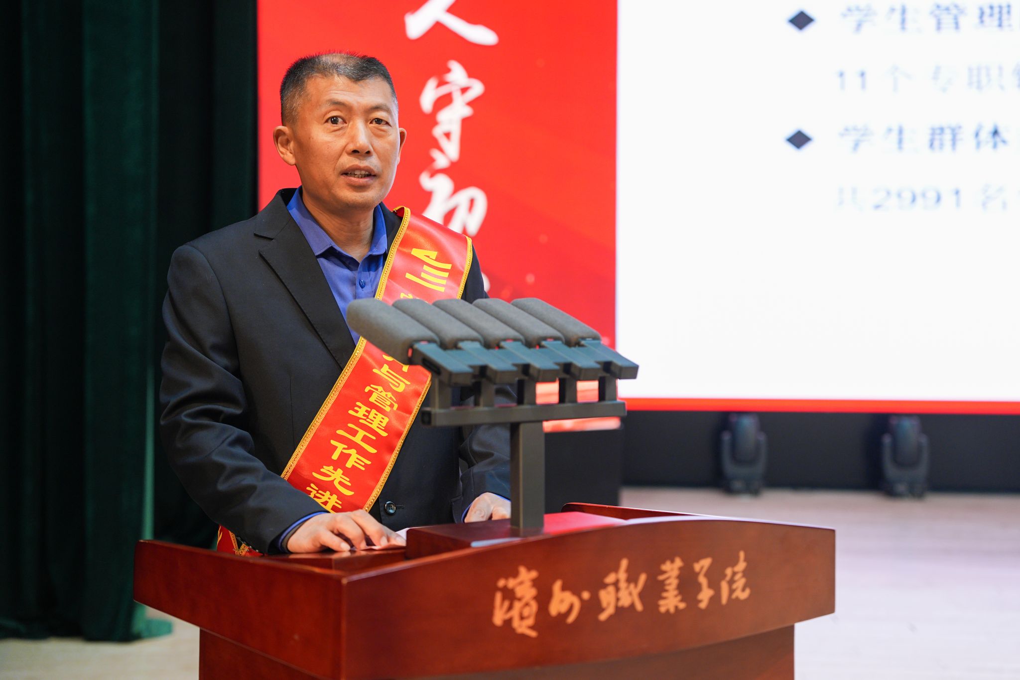 ▲ 王进博宣读《中共滨州职业学院委员会关于表彰2024-2025学年学团工作先进单位、先进集体、先进个人的通报》