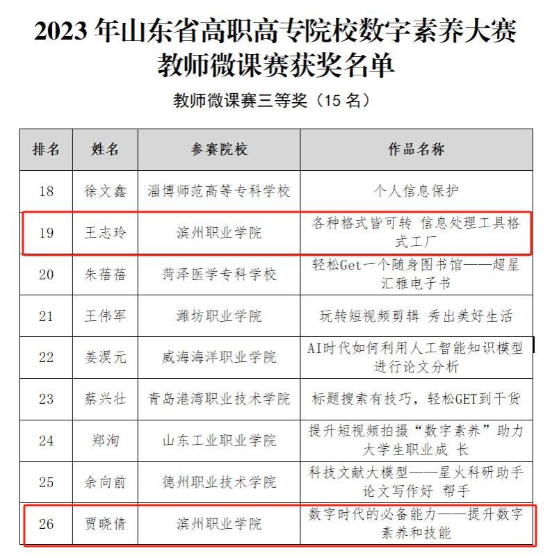 近日,由教育部高等学校图工委主办的山东省高职高专院校数字素养大赛决赛落下帷幕,全省竞赛平台注册院校共计50所,参赛人数达2万余人。经过激烈角逐我校获得二等奖1个、三等奖1个, 6名教师获评优秀指导教师,信息工程学院刘翔和孟孜烨同学获得国赛参赛资格。教师微课赛获省赛三等奖2个, 1人获评优秀先进工作者。